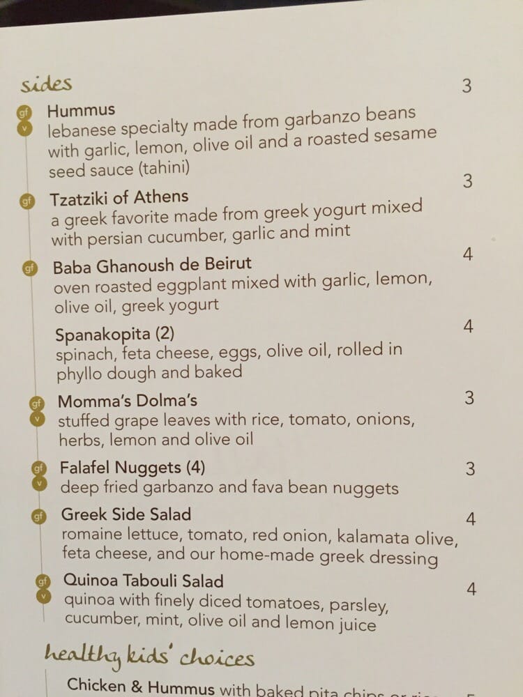 Vegan, gluten-free. Lebanese specialty made from garbanzo beans with garlic, lemon, olive oil, and a roasted sesame seed sauce (tahini).